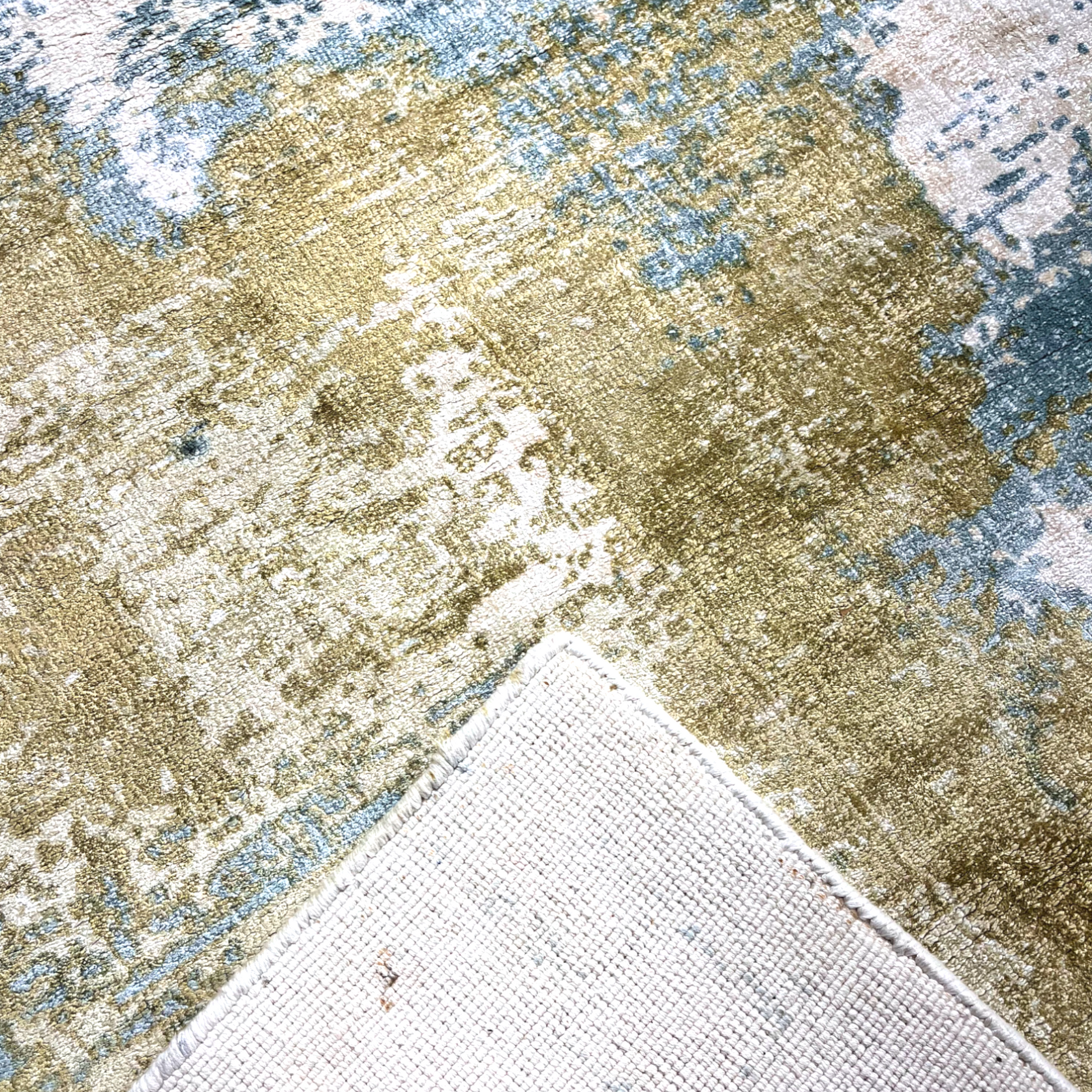 Step into a world of abstract beauty with the "Aegean Dreams Abstract Hand-Knotted Bamboo Silk Carpet," a true masterpiece of modern art for your floors. This exquisite carpet features a mesmerizing blend of cool blues and earthy golds, resembling an aerial view of a dreamlike seascape. Crafted from luxurious bamboo silk, it offers an exceptionally soft feel and a lustrous sheen that captures the light, enhancing its dynamic colors and intricate patterns. With a 10-12mm pile height and a dense knotting density of 10-36 knots per square inch, this carpet promises both comfort and durability.