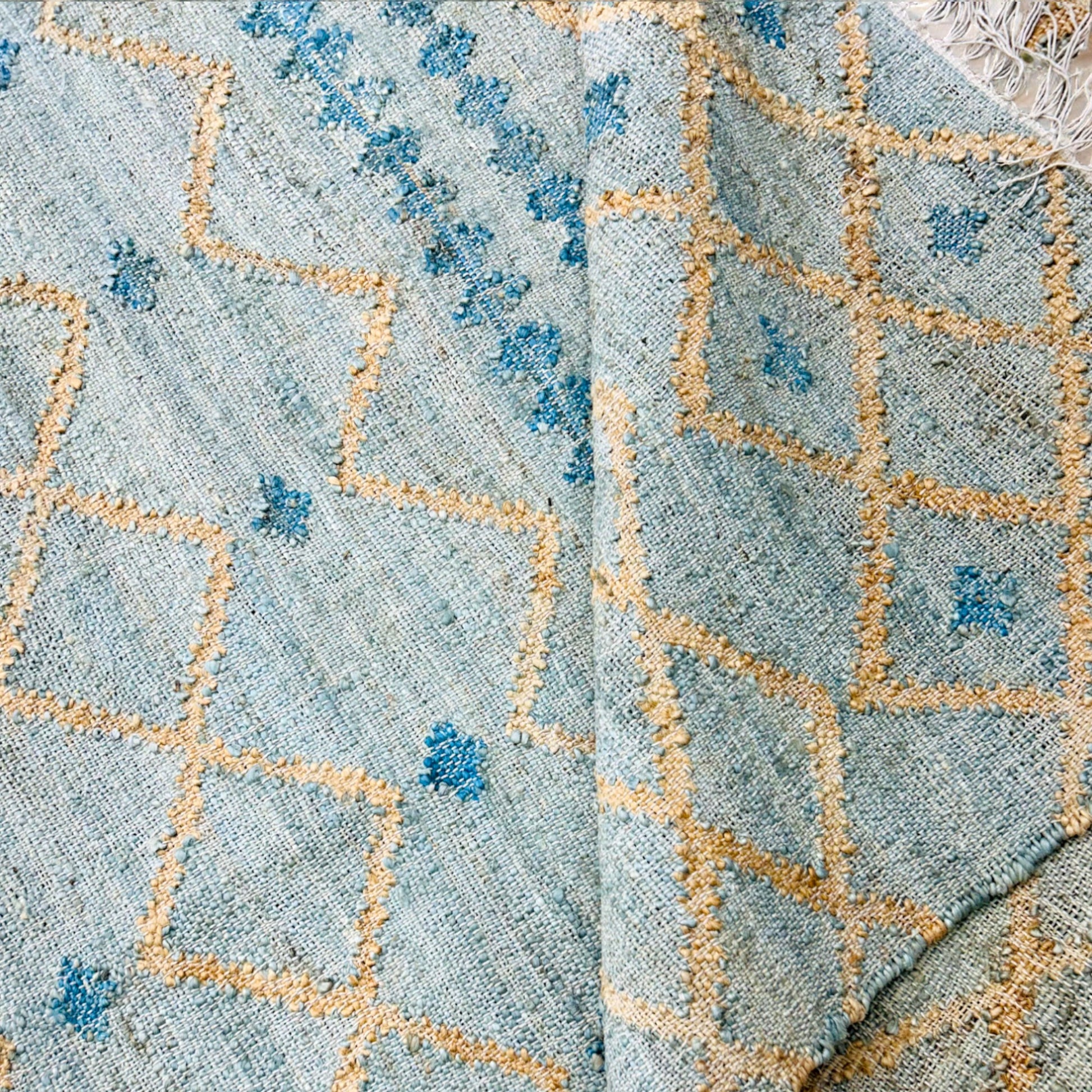 Introduce the refreshing allure of the seaside into your decor with the "Coastal Charm Kelim Jute Durrie." This beautifully woven durrie features traditional kelim craftsmanship, presenting an intricate pattern that combines waves and geometric shapes in shades of blue and gold.