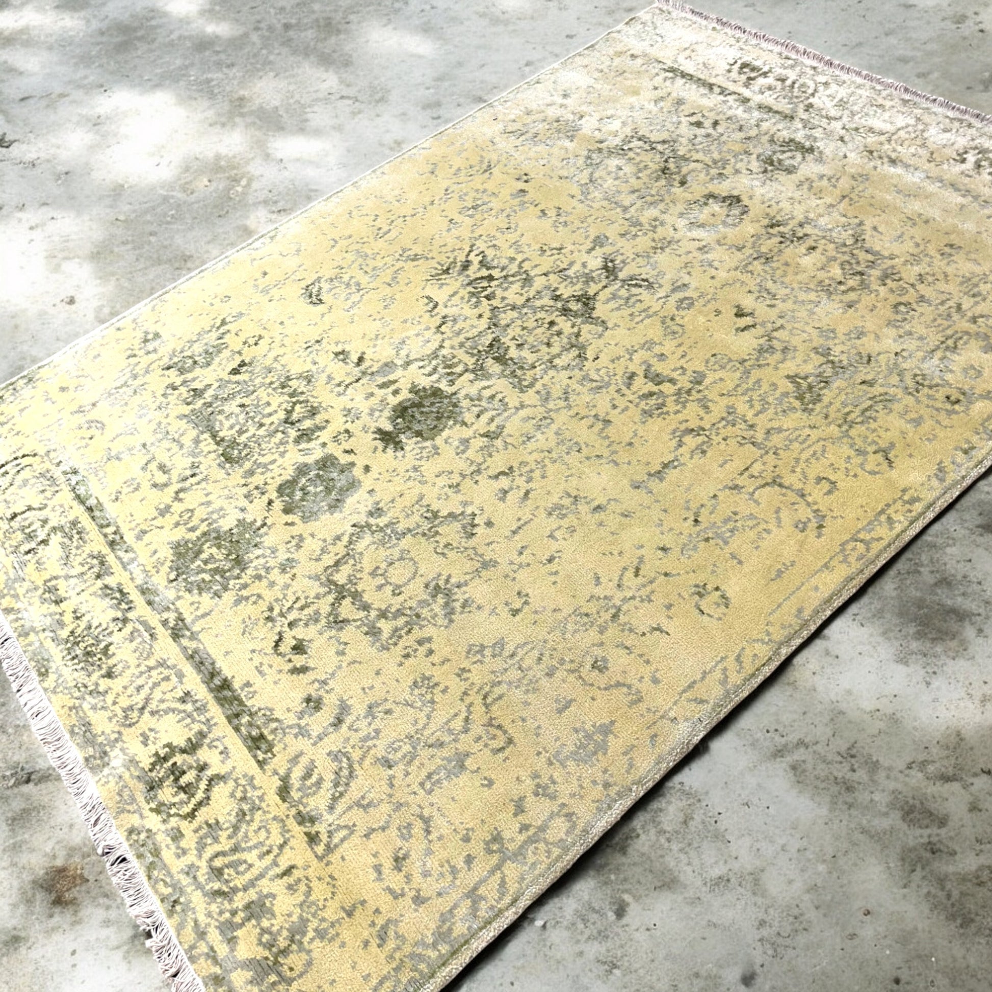 This exquisite carpet is meticulously hand-knotted, offering a dense pile height of 10-12mm that ensures plush comfort underfoot. The intricate knotting technique, boasting 10-36 knots per square inch, reveals a detailed and faded pattern that captures the essence of vintage charm, while the subtle yellow and green hues provide a modern twist suitable for any elegant home setting.
